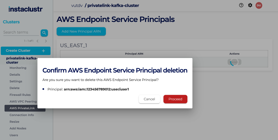 - To remove an existing Principal ARN, locate it in the table and click on the Delete button in the Actions column alongside it. A dialog box will appear where you can confirm your removal of the Principal ARN. Click on Proceed to remove the Principal ARN.