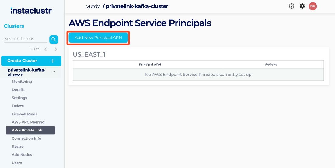 - Once your cluster has been provisioned, you can manage Principal ARNs through the Instaclustr console. Navigate to the AWS PrivateLink tab of your cluster and then click on Add New Principal ARN.