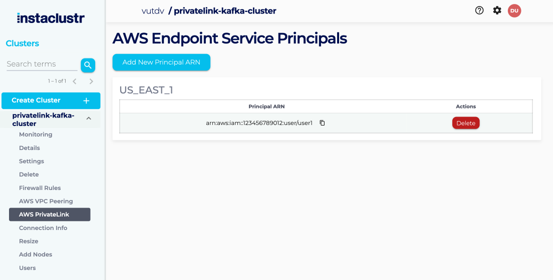 This article describes how to manage AWS Endpoint Service Principals for PrivateLink clusters using the Instaclustr Console. ARN stands for Amazon Resource Name and uniquely identifies AWS resources. You can read more about ARNs here. AWS principals, such as AWS accounts, IAM users, and IAM roles can be used to allow a connection from your endpoint to a PrivateLink cluster’s endpoint service privately. You can read more about PrivateLink and our support for it here. Our interface for the AWS Endpoint Service Principals provides the following functions:
