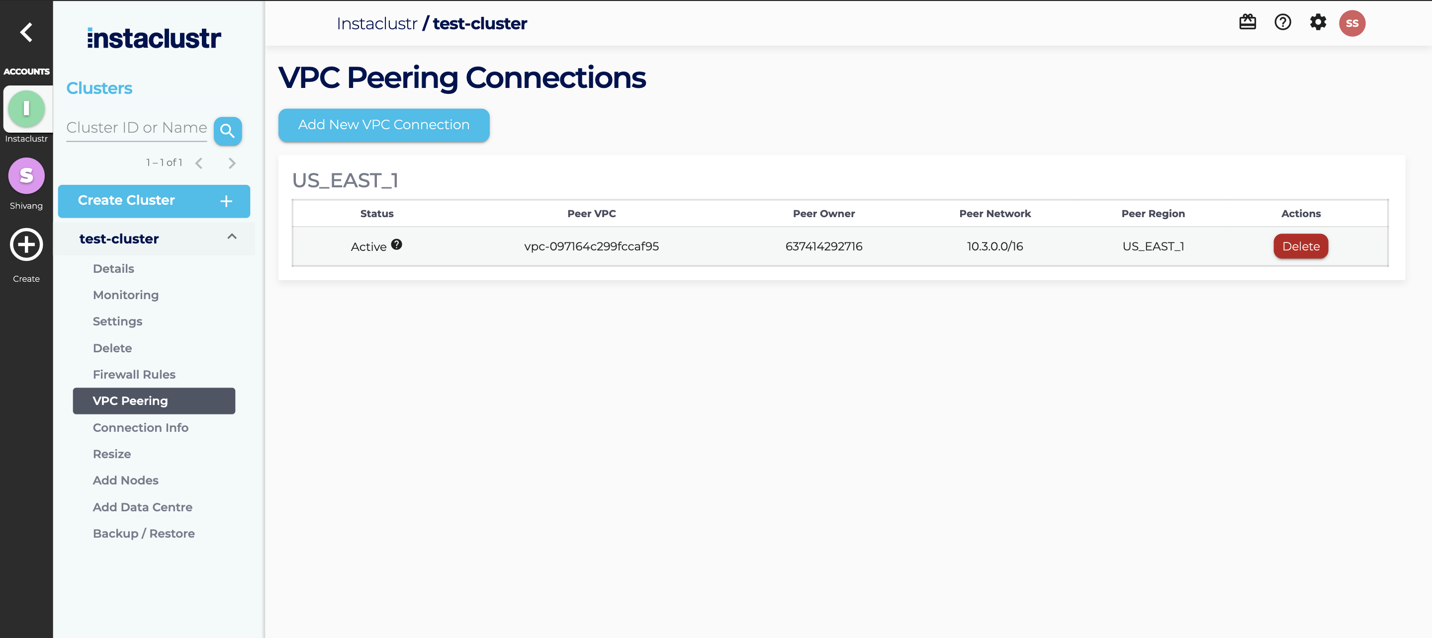 - Once your cluster has been provisioned, you can create a VPC Peering request through the Instaclustr console. Navigate to the VPC Peering tab of your cluster and then click on Add New VPC Connection.