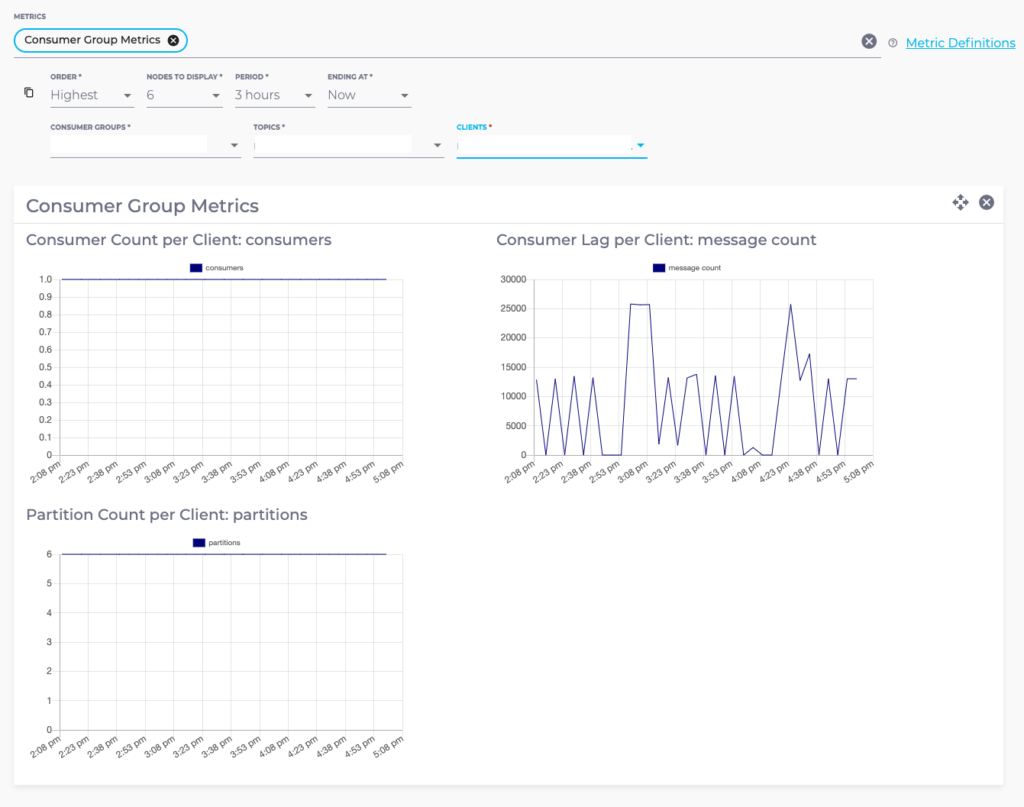The Consumer Group Metrics group will contain the metrics collected on Kafka consumer groups that are live and consuming from topics. The metrics available are