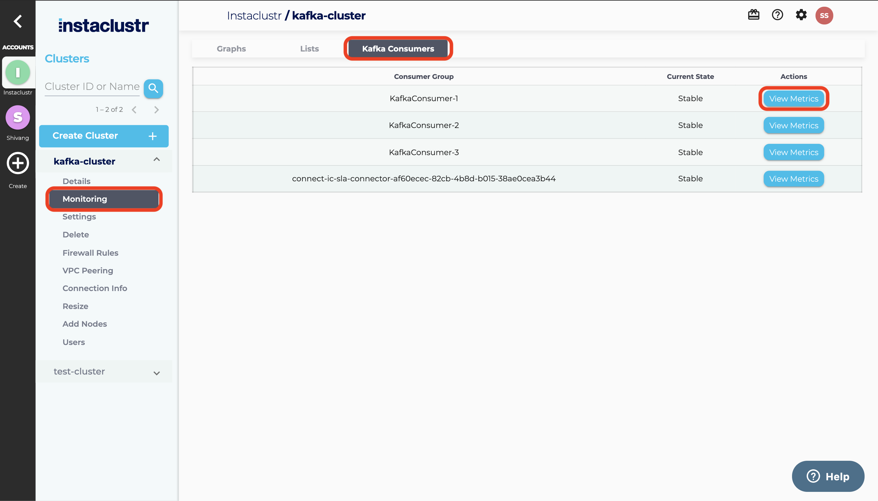 - Navigate to the Kafka Consumers tab. On this page, you will be able to see a complete list of consumer groups that your Kafka cluster currently reports and their associated state according to Kafka. Clicking on View Metrics for a particular consumer group will take you to the consumer group client metrics view.