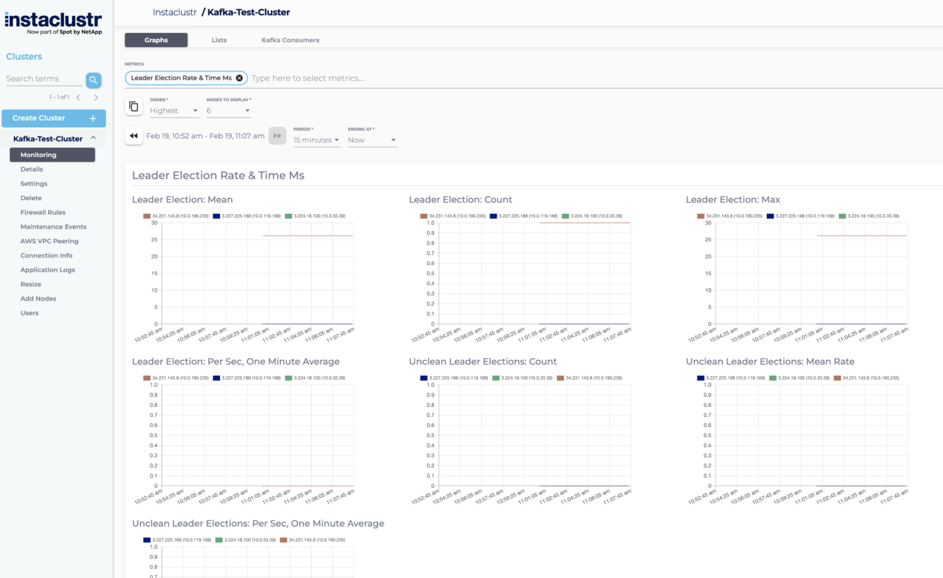 The Leader Election Rate & Time Ms metric group contains metrics regarding leader elections. These metrics are related to ZooKeeper and unavailable for Kafka clusters running with KRaft mode. The metrics available are:
