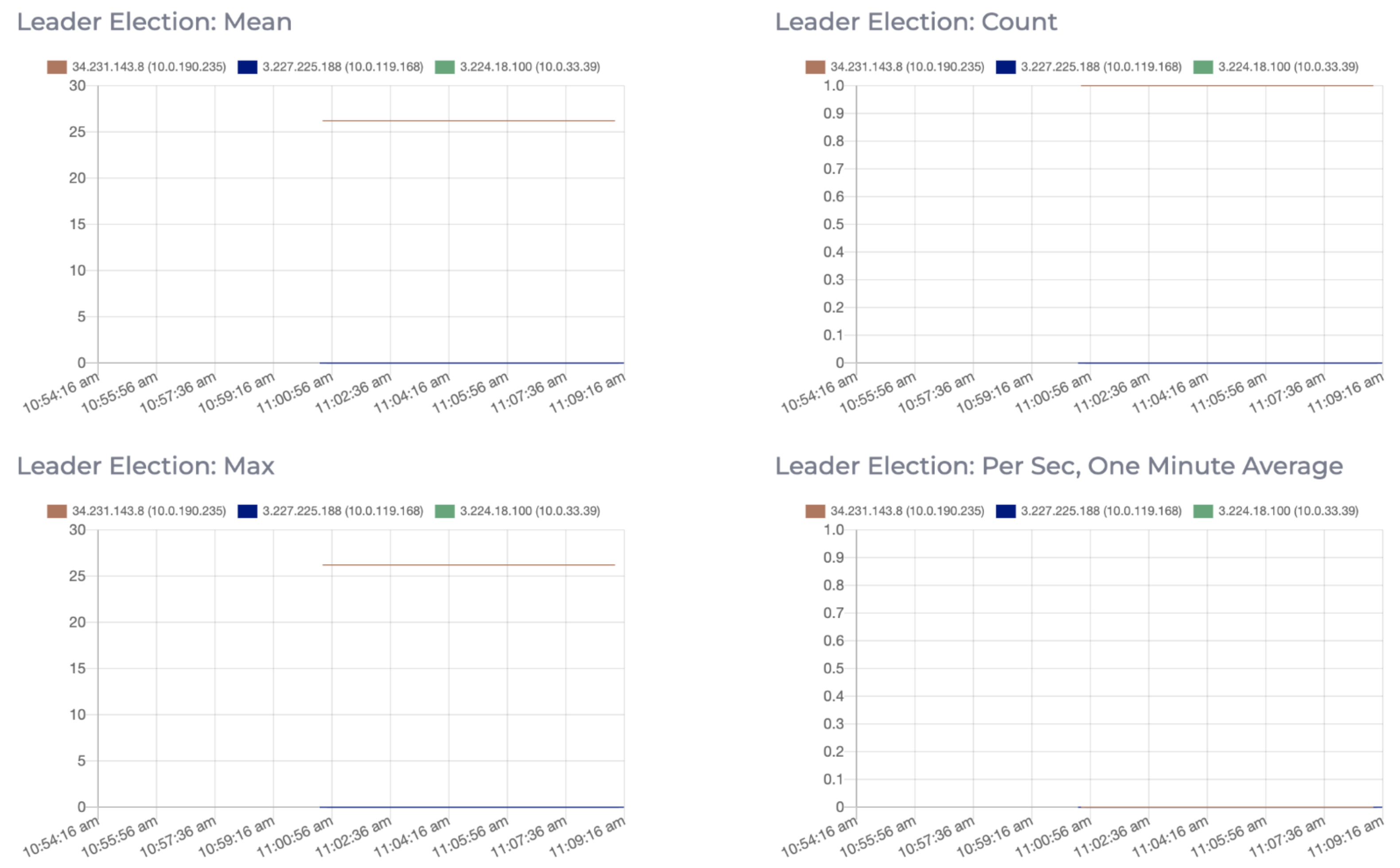 The Leader Election metric shows the mean rate, count, maximum rate, and one minute rate (per second rate, averaged over the past minute) of leader elections. Leader elections occur when the current leader of a partition becomes unavailable. Any available in-sync replicas for the partition are eligible to become the new leader. As the new leader must be an in-sync replica, elections should not cause any problems apart from a small delay in responding to requests to that partition while the new leader is being chosen.