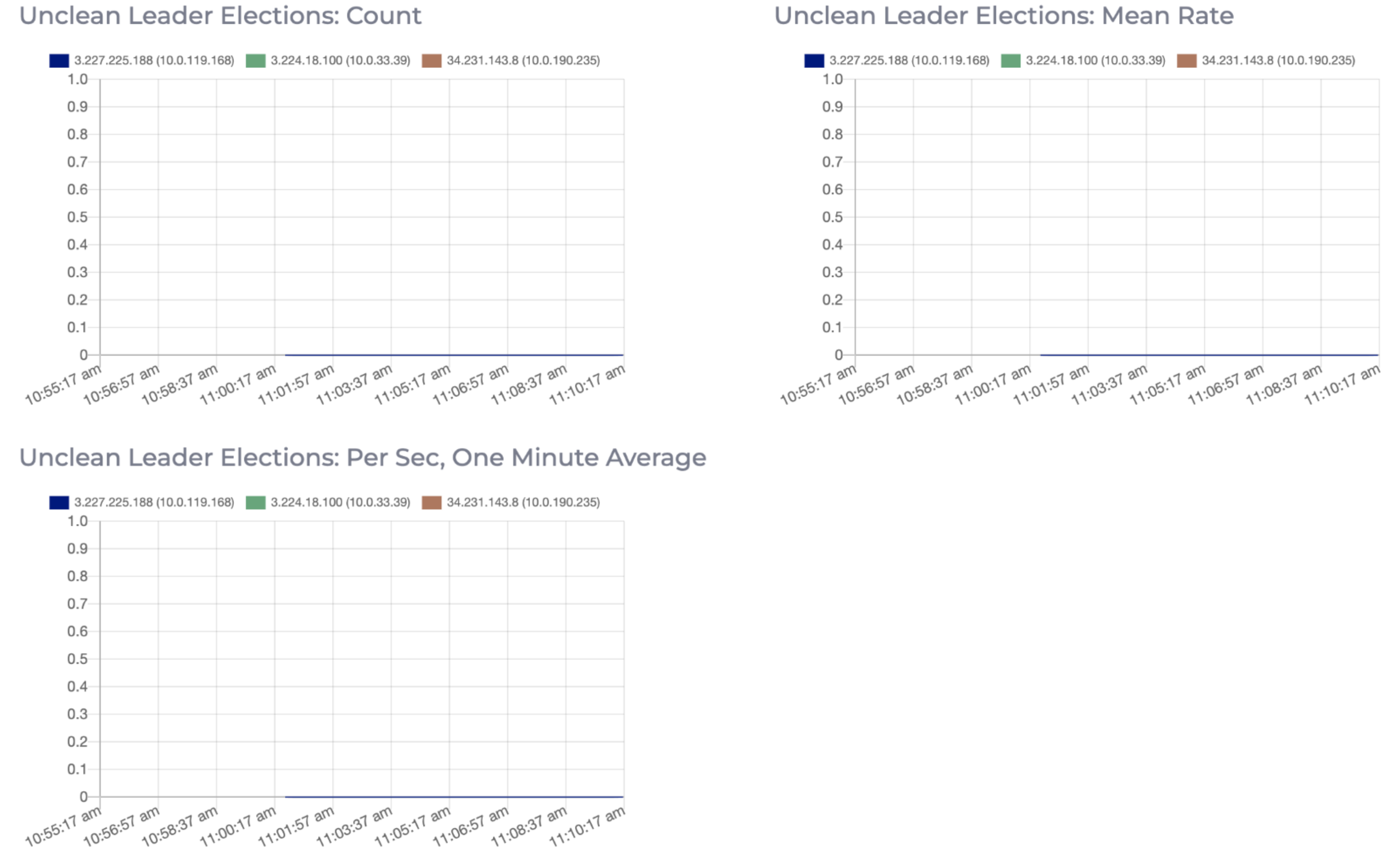 The Unclean Leader Elections metric shows the number of failures to elect a suitable leader per second. The graphs show the Count, Mean Rate and One Minute Average, of the per second rate. Unclean leader elections are caused when there are no available in-sync replicas for a partition (either due to network issues, lag causing the broker to fall behind, or brokers going down completely), so an out of sync replica is the only option for the leader. When an out of sync replica is elected leader, all data not replicated from the previous leader is lost forever.