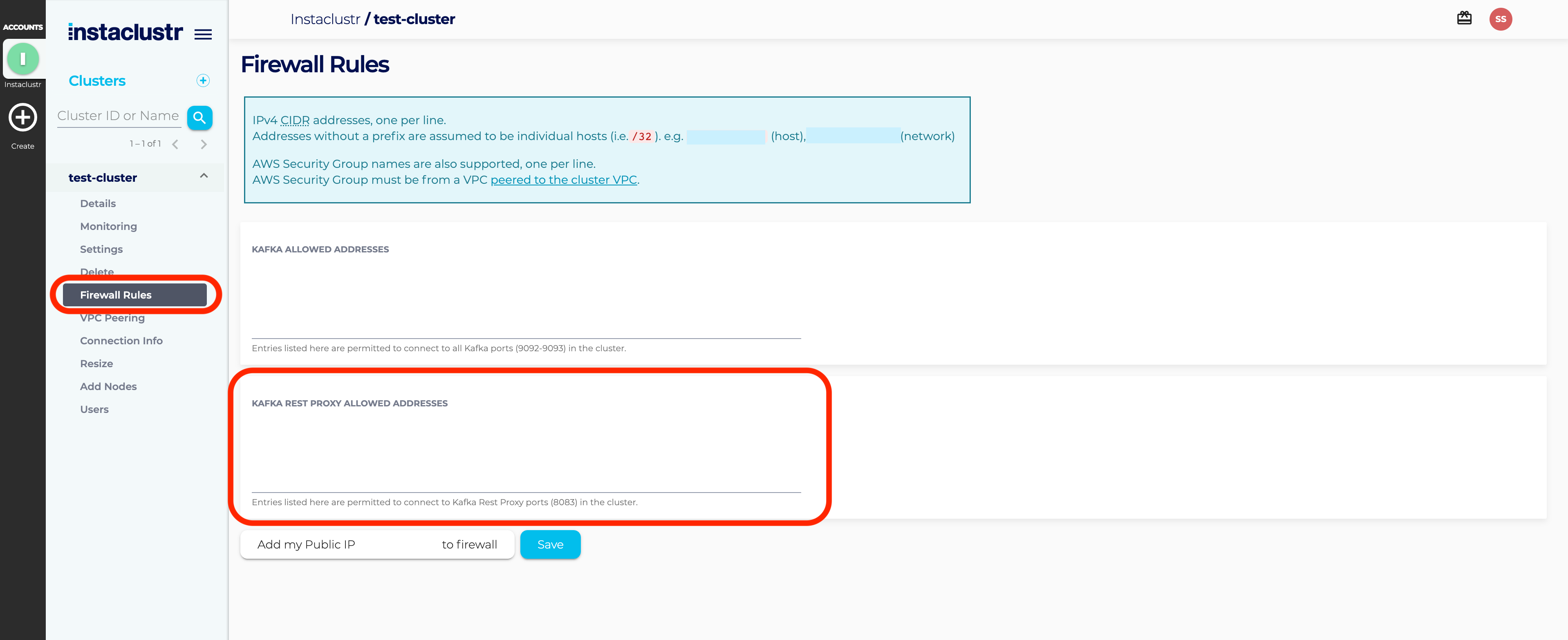 To start using the Kafka Rest Proxy, you must first open the firewall to your client application IP address. Once your cluster is up and running, go to Firewall Rules and add your IP address to the Kafka REST Proxy Allowed Addresses.