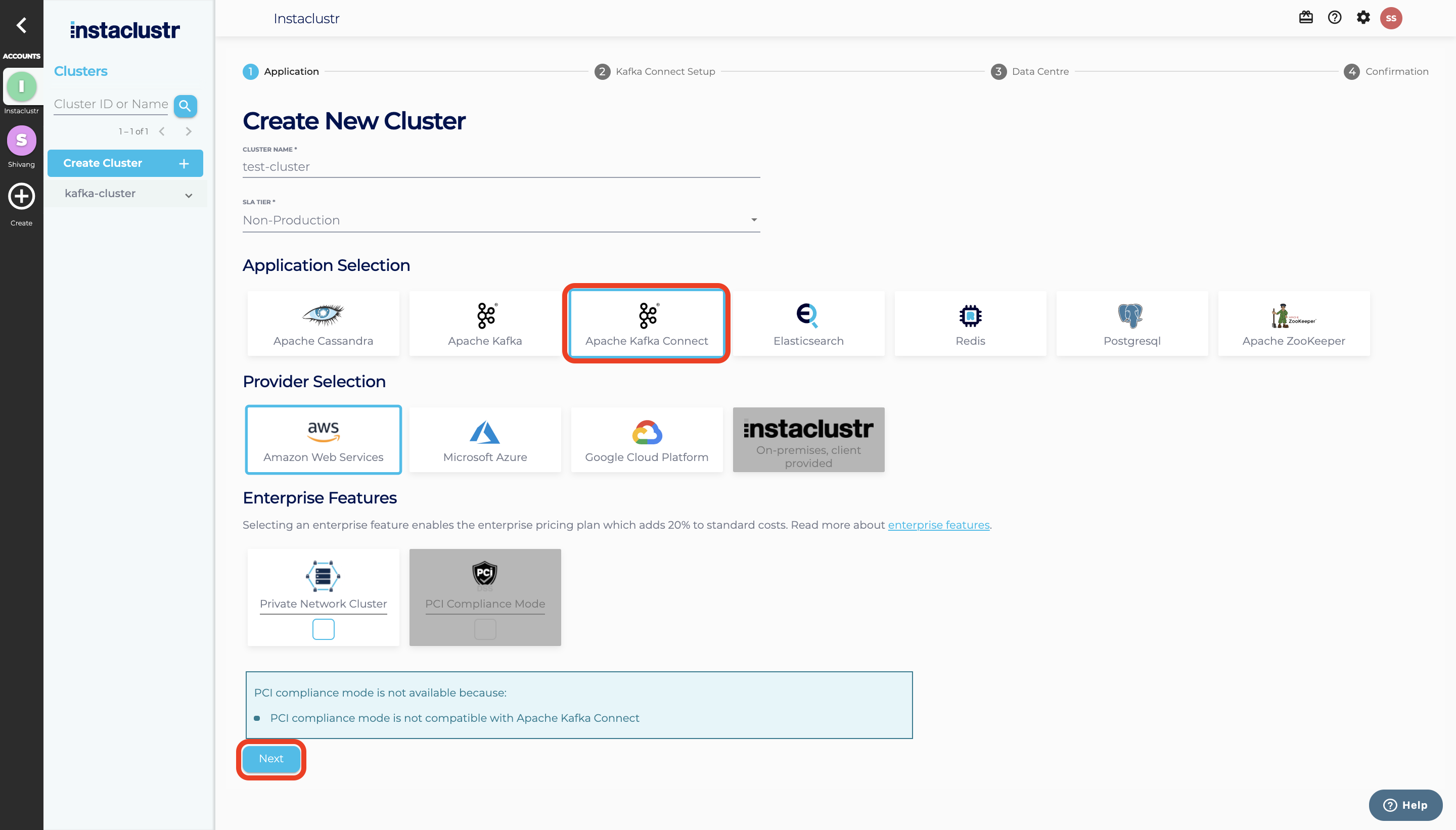 - In the Application section, select Kafka Connect as the base application. Enter a unique name for your cluster and select your Infrastructure provider. You can also choose to enable Private Network add-on for the Kafka Connect cluster. The Private Network add-on is available for AWS, GCP and Azure AZ providers. For Azure AZ, private network clusters are available when the cluster is running in your own cloud provider account. More information on Private Network add-on can be found at Private Network cluster.