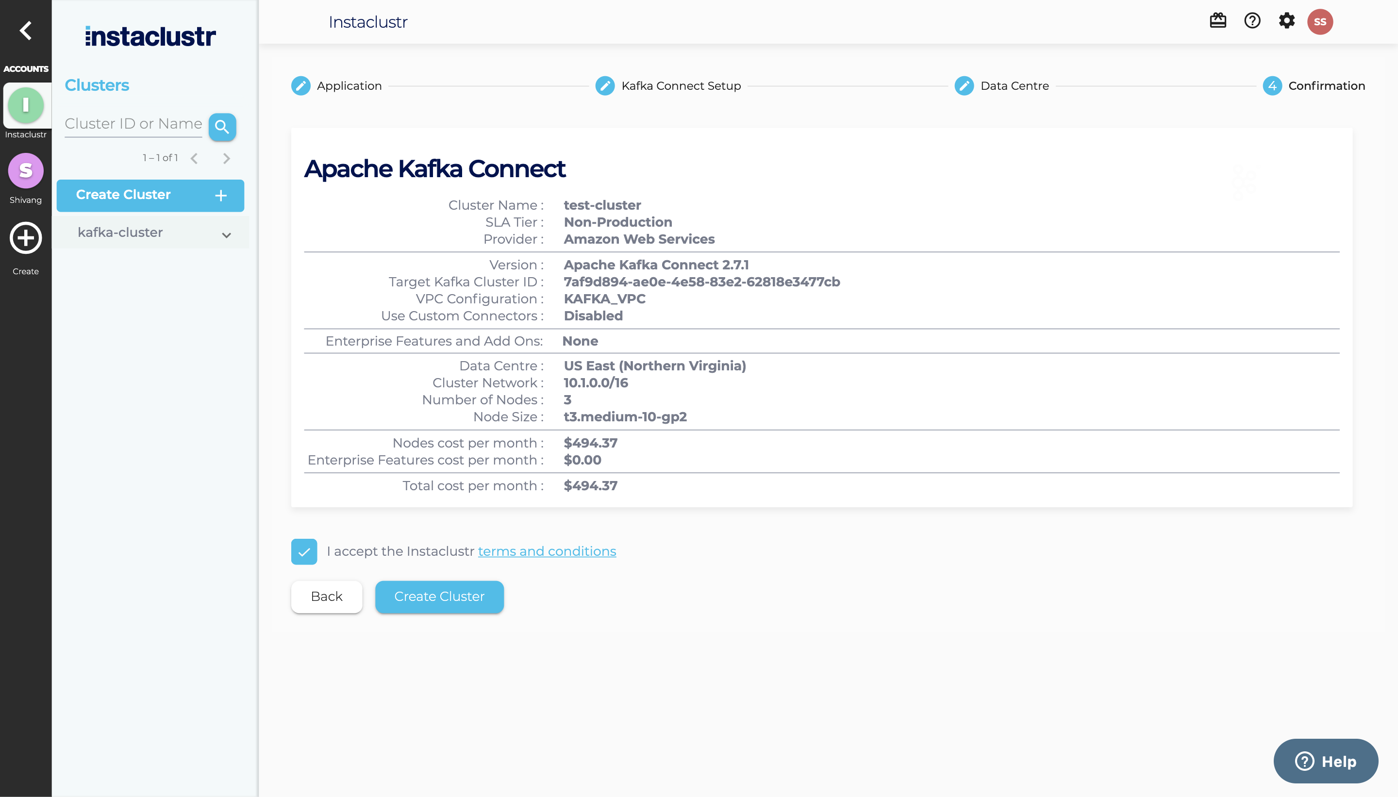 - The Confirmation section displays a brief summary of your cluster configurations and pricing details. Click the Terms and Conditions link to open the Instaclustr Terms and Conditions. After going through the document, select the checkbox to accept the Terms and Conditions. Once you are happy with the cluster configuration and have accepted the terms and conditions, click the Create Cluster button to start provisioning the cluster.
