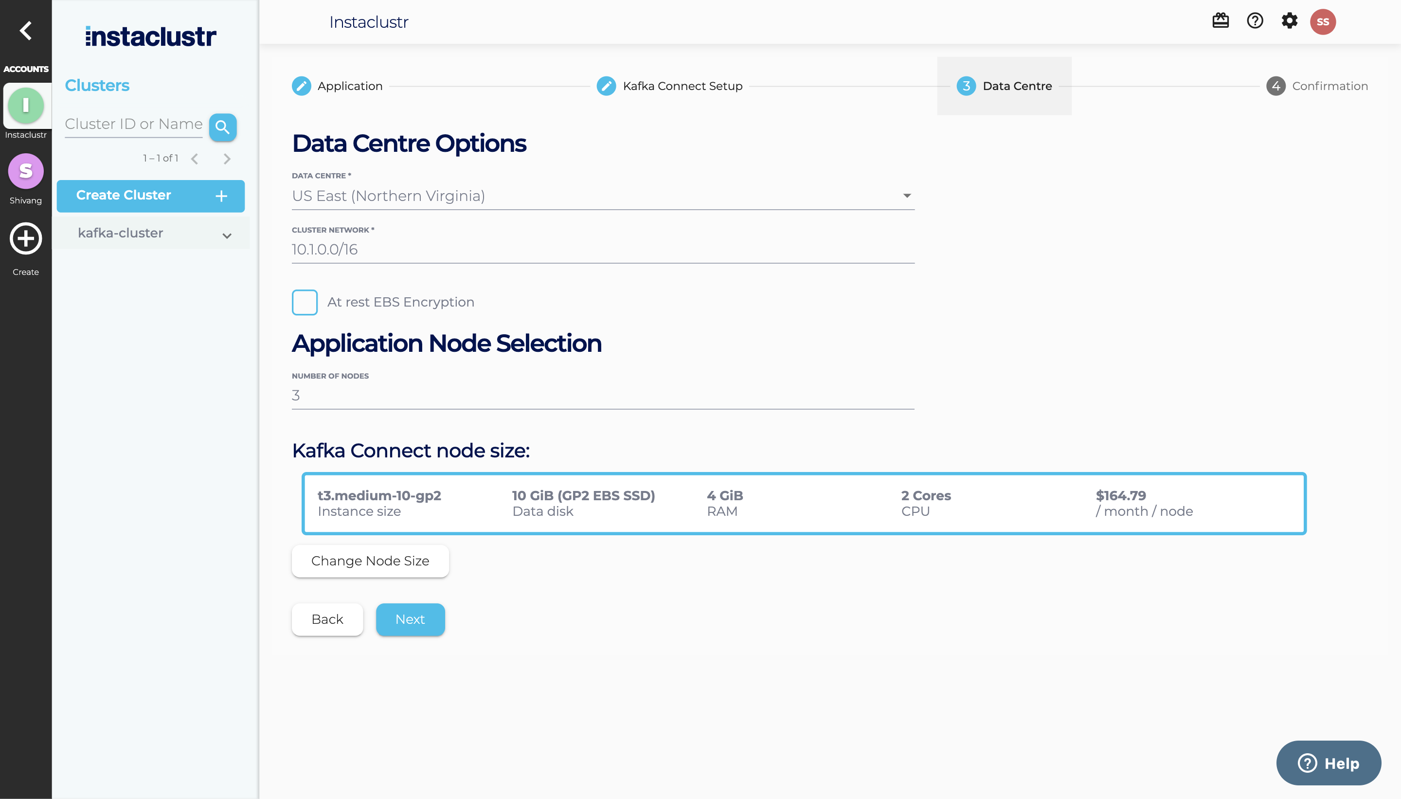 The third option is to provision the Kafka Connect cluster in a new VPC without setting up peering. This will cause the Kafka Connect and Kafka clusters to connect over public IPs. - If you plan on using your own custom connectors (bring your own code) on your Kafka Connect cluster, tick the Use Custom Connectors checkbox and fill out the name and access credentials of the cloud storage area where you will be placing your custom connectors. See our support page on how to set up a cloud bucket to store custom connectors for more information.