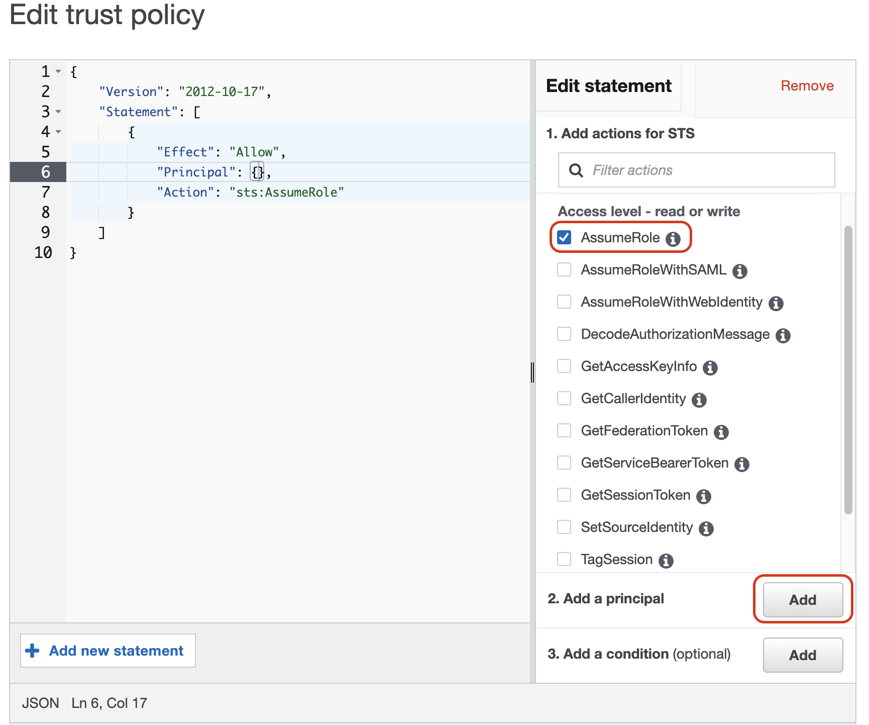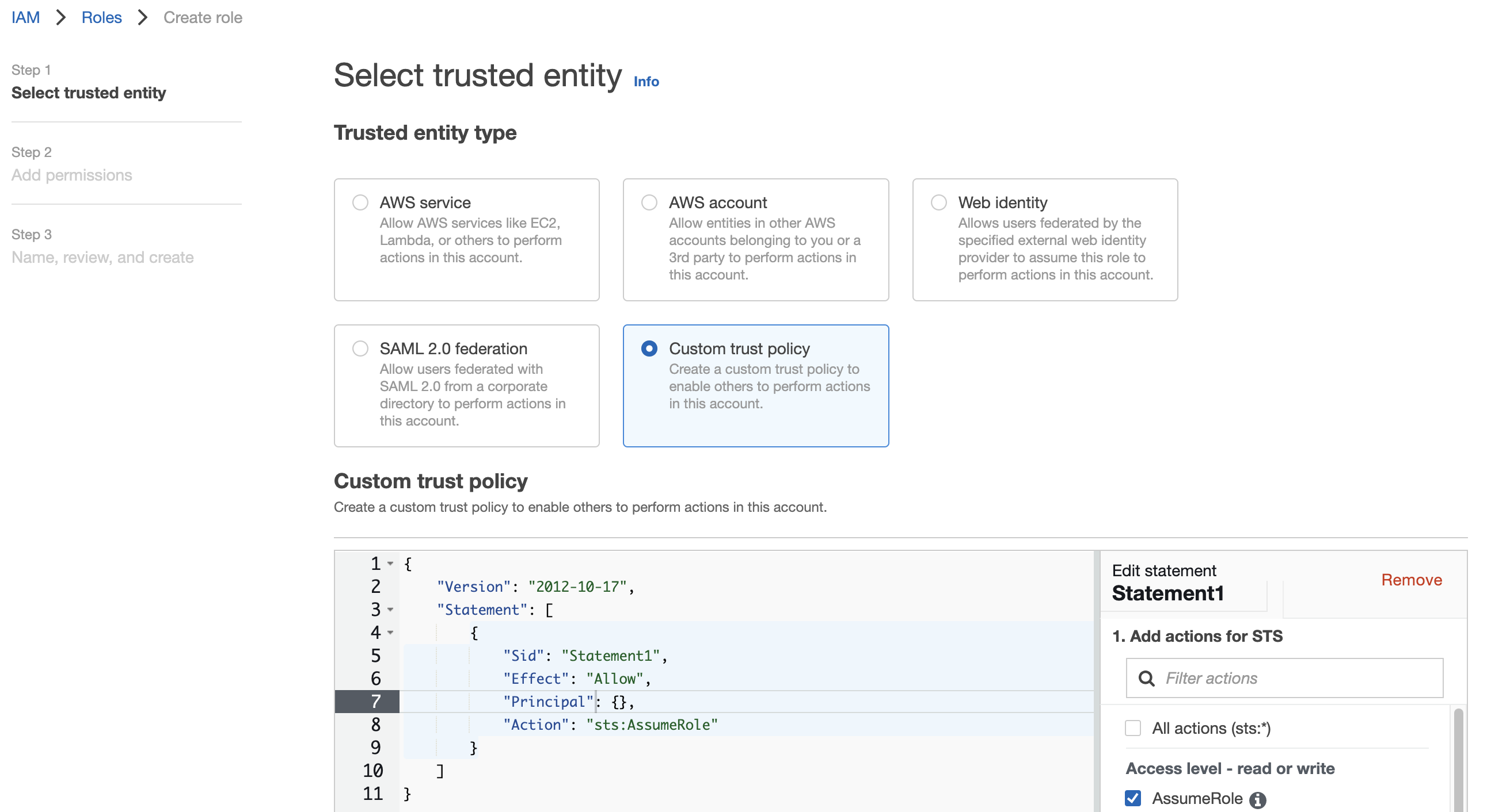 1234567891011{"Version": "2012-10-17","Statement": [{"Effect": "Allow","Principal": {},"Action": "sts:AssumeRole","Condition": {}}]} - Create a role with the trust policy