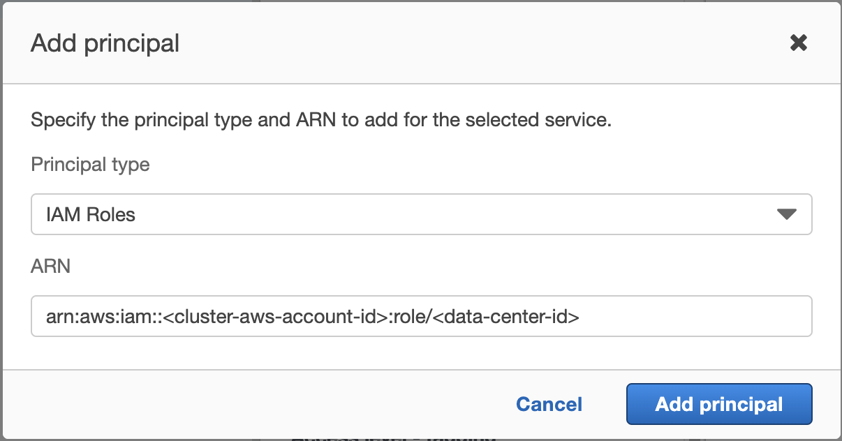 12345678910111213{"Version": "2012-10-17","Statement": [{"Effect": "Allow","Principal": {<strong>"AWS": "arn:aws:iam::<cluster-aws-account-id>:role/<data-center-id>"</strong>},"Action": "sts:AssumeRole","Condition": {}}]} - Update the trust policy of S3 access role