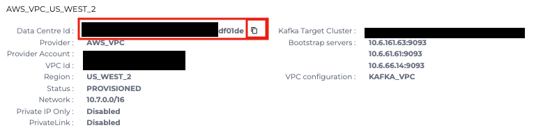 - After the Kafka Connect cluster gets to PROVISIONING state, go to the cluster, Details tab and copy the Data Center Id. This Id is also the name of the AWS instance role that the cluster is using