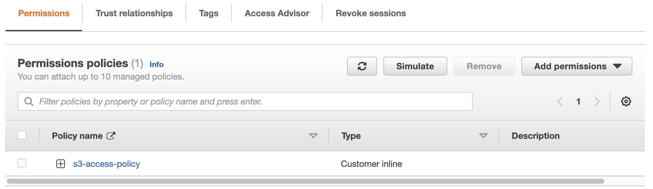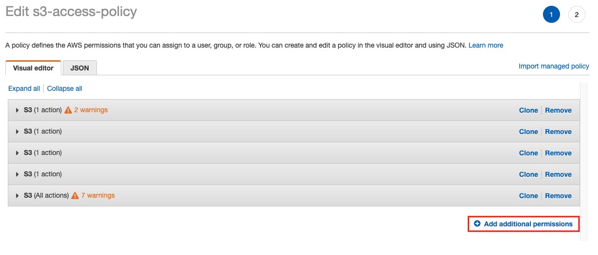 - From here you can either edit the existing policy (s3-access-policy) and add the permission or add a new policy to the role