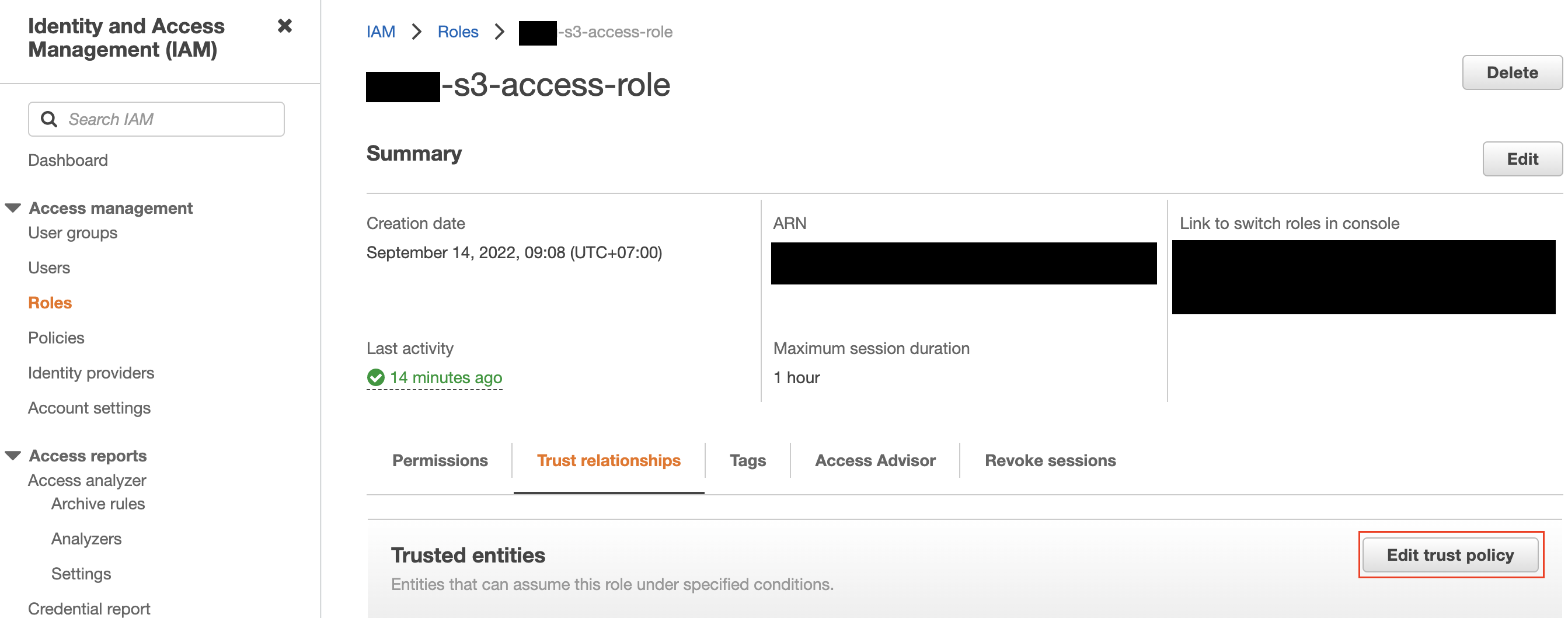 - Create the S3 access role with the S3 access policy and copy its ARN