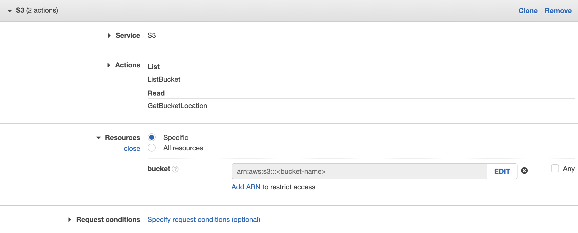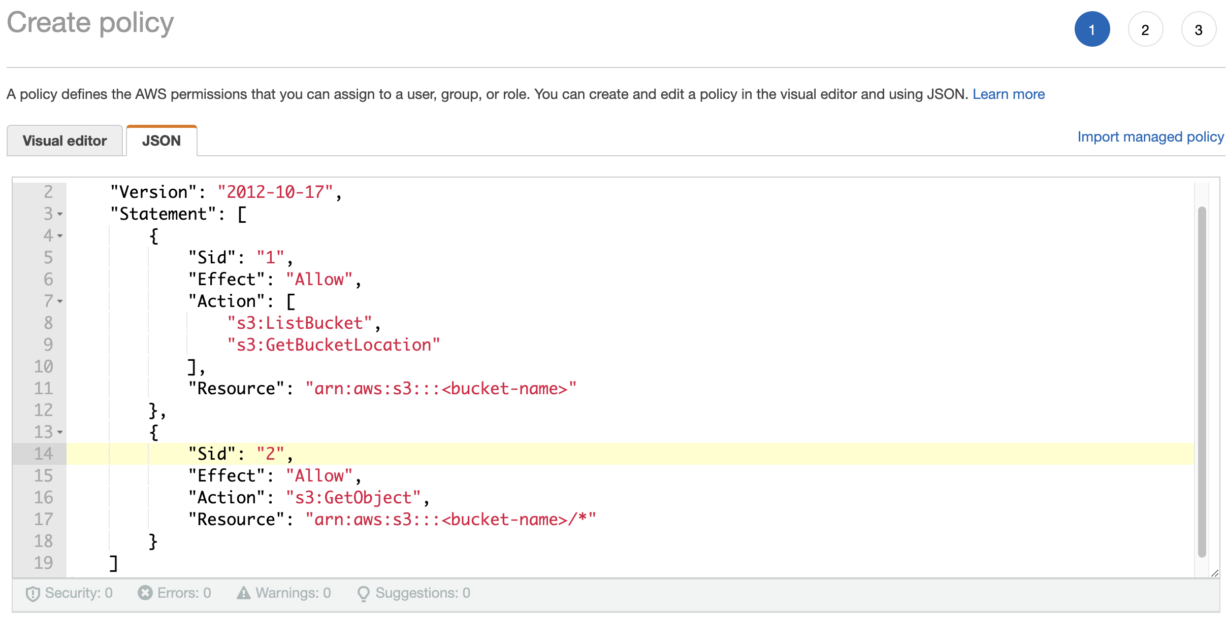 123456789101112{"Sid":"<new unique statement name>","Effect":"Allow","Action":["s3:ListBucket","s3:GetBucketLocation"],"Resource":"arn:aws:s3:::<S3 bucket name>"},{"Sid":"<new unique statement name>","Effect":"Allow","Action":"s3:GetObject","Resource":"arn:aws:s3:::<S3 bucket name>/*"}