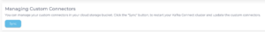 After the policies are set up correctly and the cluster hits RUNNING state, head to the Managing Custom Connectors section in Connectors page and press Sync to load the custom connectors.