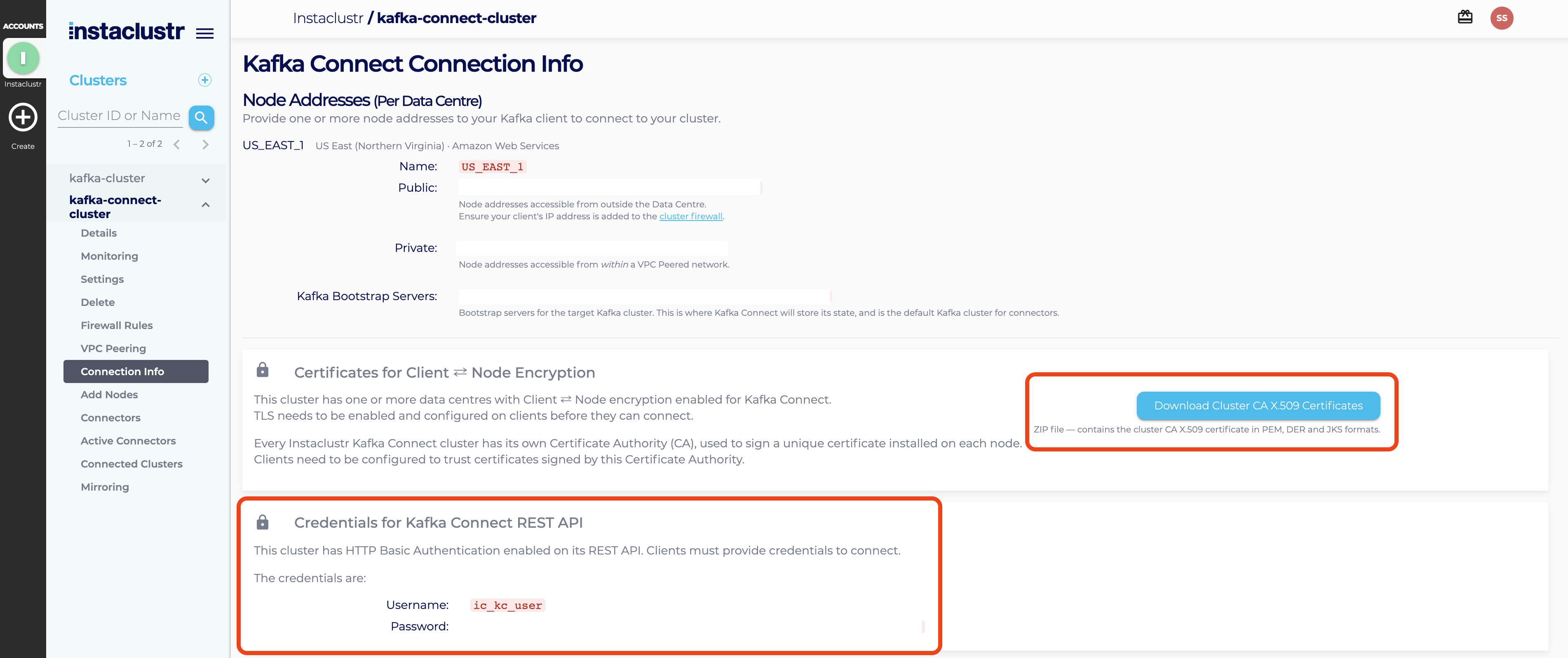 - You will need to obtain the access credentials for your REST API from the Connection Info page. If your HTTP client is configured to verify the server identity, you will also need to obtain your Kafka Connect cluster’s server certificates from the Connection Info page:
