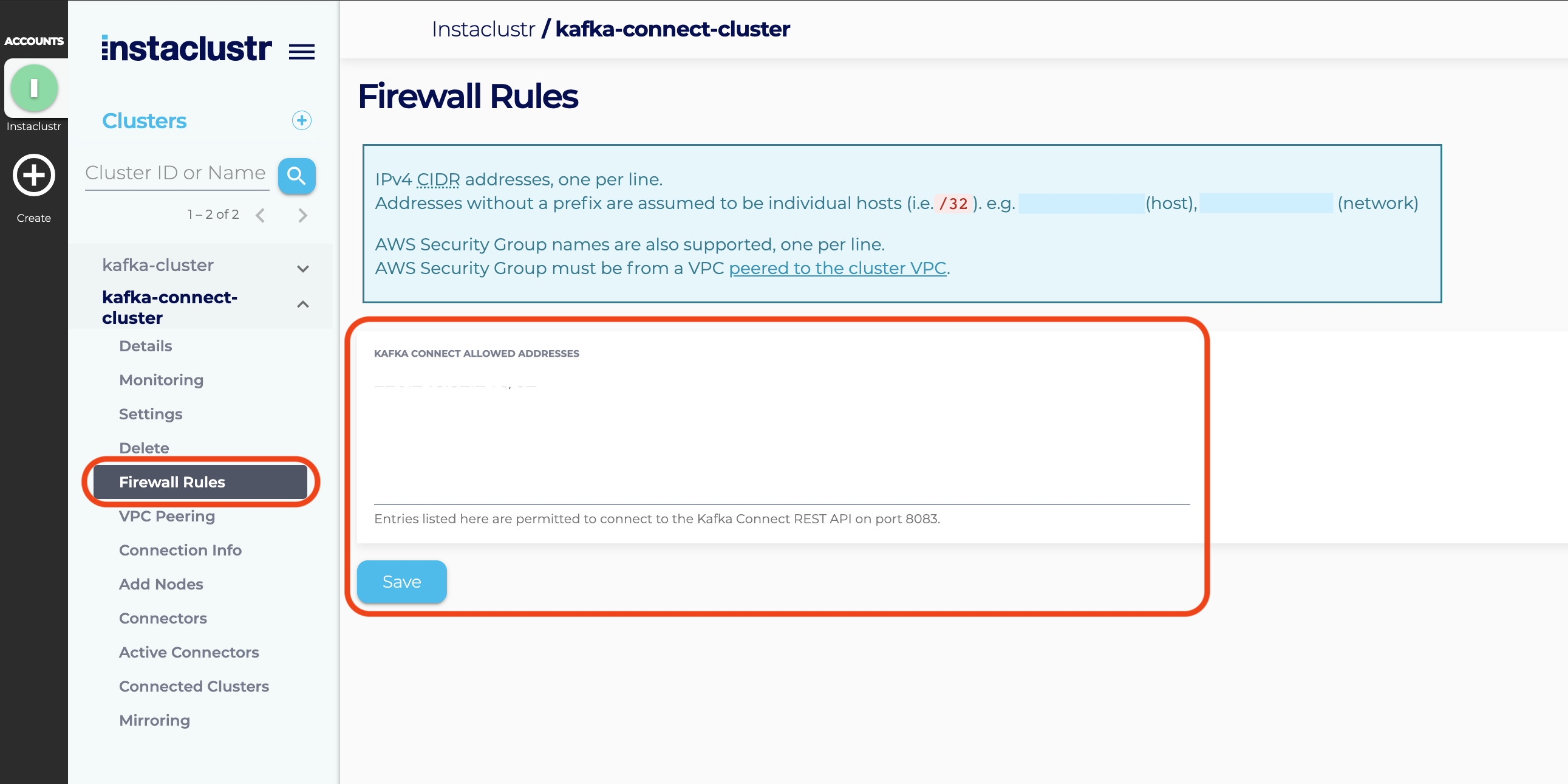 - With this information, you can now confirm your access to the REST API by issuing a simple request to show you which connectors are available in your cluster. NOTE: if Private Network add-on is enabled, you need to set up VPC peering before accessing the API, more information is at Connect to Kafka and Kafka Connect Using VPC Peering (AWS)