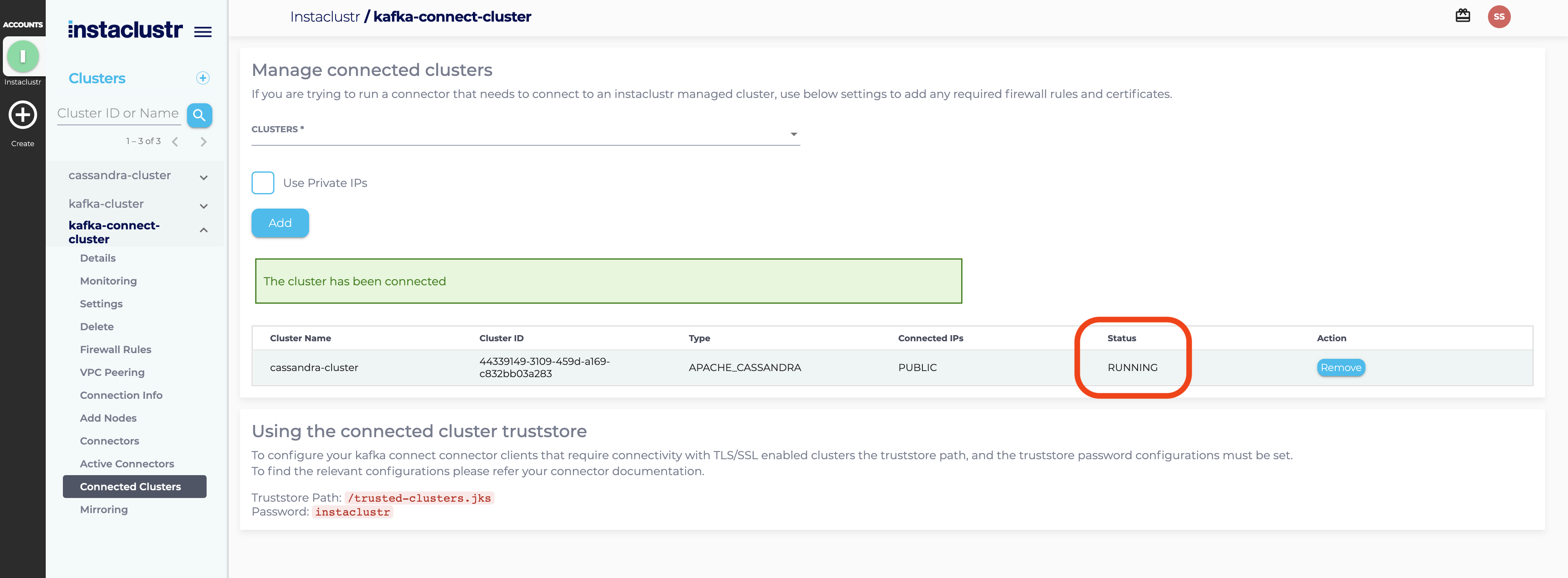 - When the required firewall and truststore configuration is successfully completed, you will be able to see a new entry for the added cluster with a status of Running.