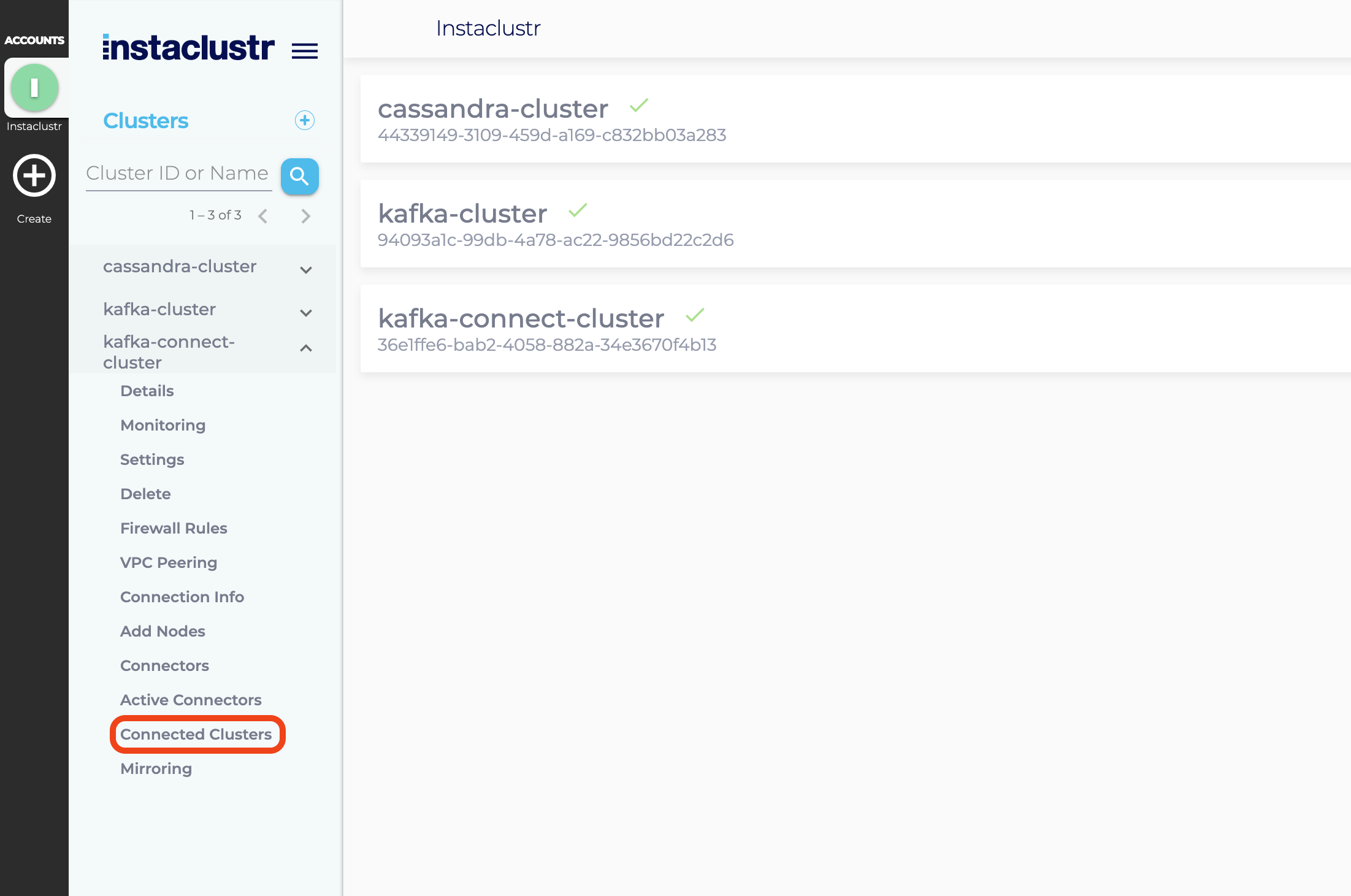- To reach the Connected Clusters view, click on Connected Clusters under the sidebar menu of the Kafka Connect Cluster.