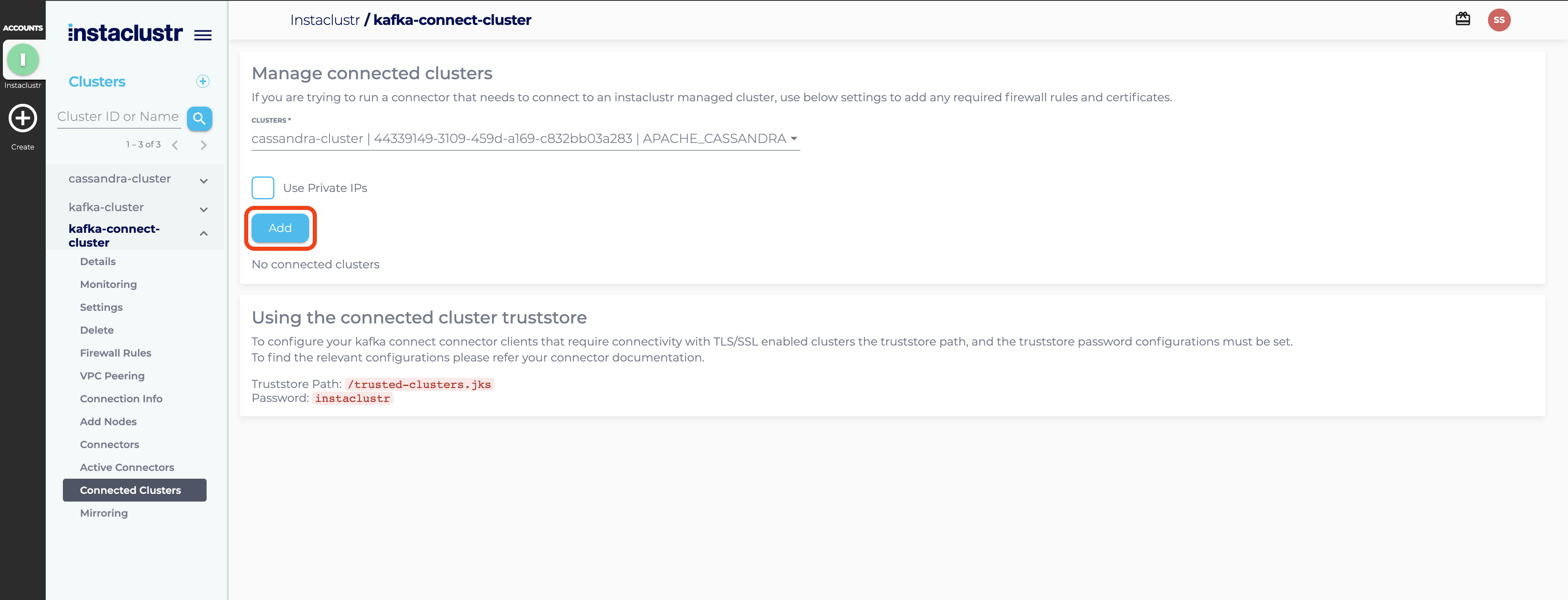 - In the Connected Clusters view select the cluster you wish to connect to and click on the Add button. If you intend to use Private IPs to connect to the cluster via VPC Peering, remember to enable the checkbox Use Private IPs.