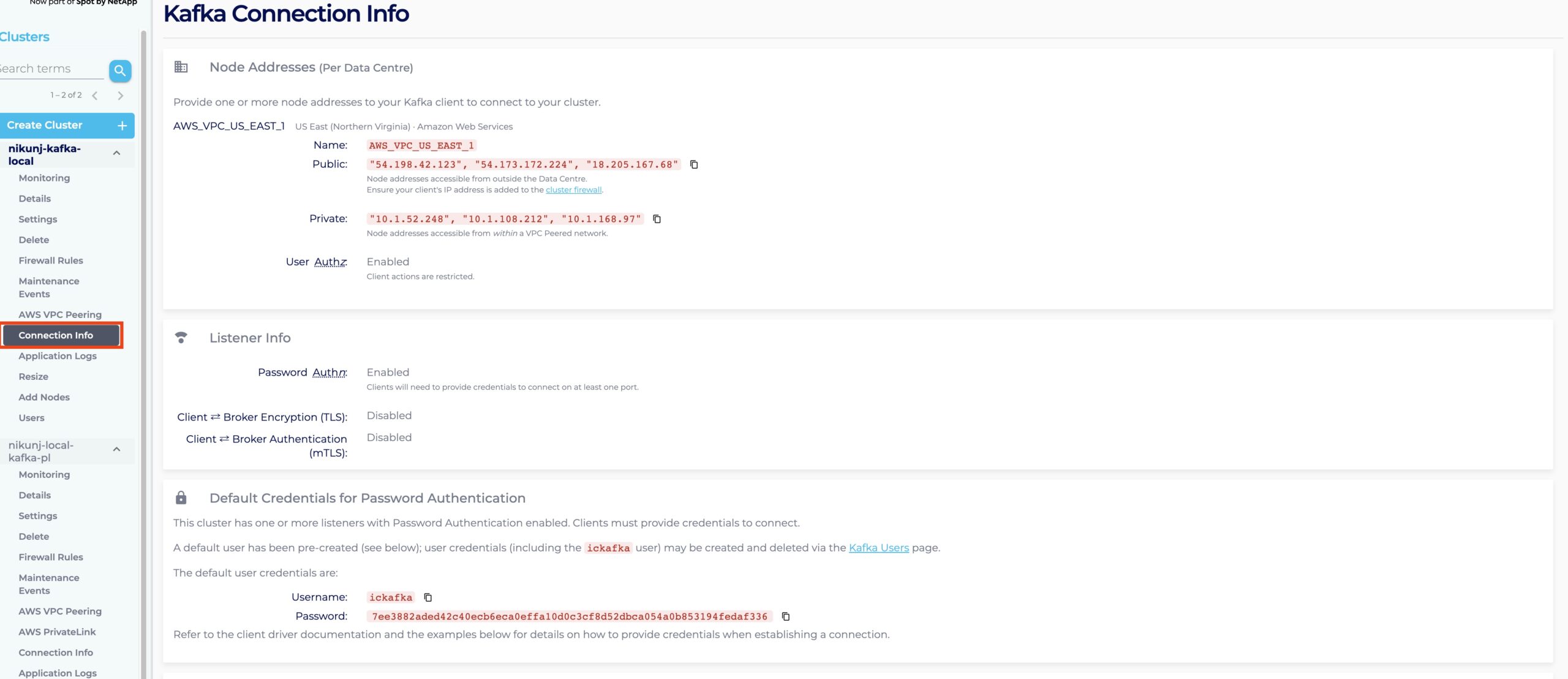 | <ic-kc-password> | This is the password for the kafka connect cluster you provisioned in one of the previous steps. This value can be found by selecting your Kafka Connect cluster in the instaclustr console and navigating to the “Connection Info” tab. Importantly this value will be different to the password for your Kafka Cluster which you used in the previous step. |