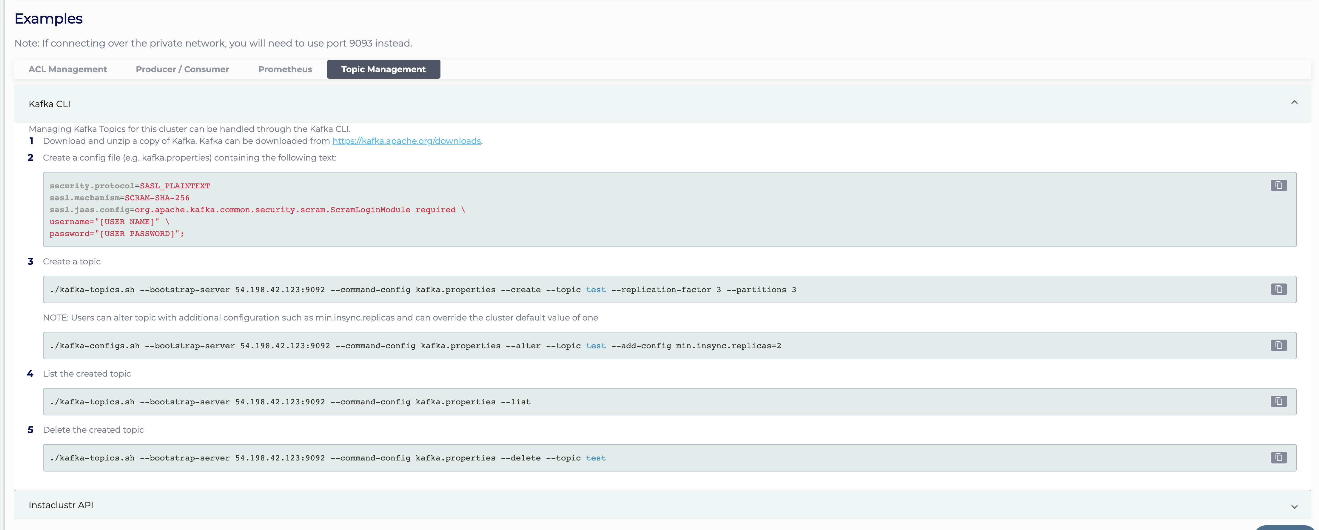 For Kafka Connect to work, sources and sinks must refer to specific Kafka Topics. Create a new Kafka Topic named “S3TestTopic”. For Kafka Connect to work, sources and sinks must refer to specific Kafka Topics. Create a new Kafka Topic named “S3TestTopic”. Instructions can be accessed by Navigating to the ‘Connection Info’ tab of your Kafka Cluster: