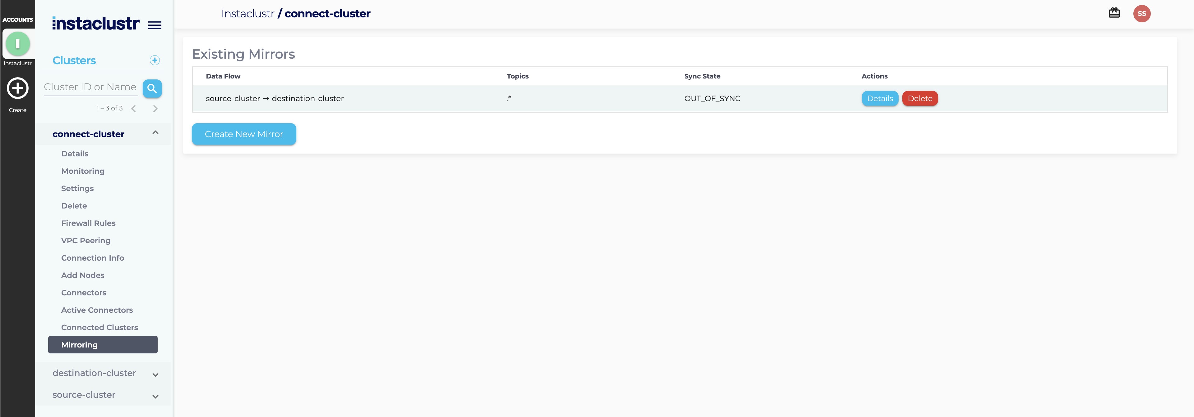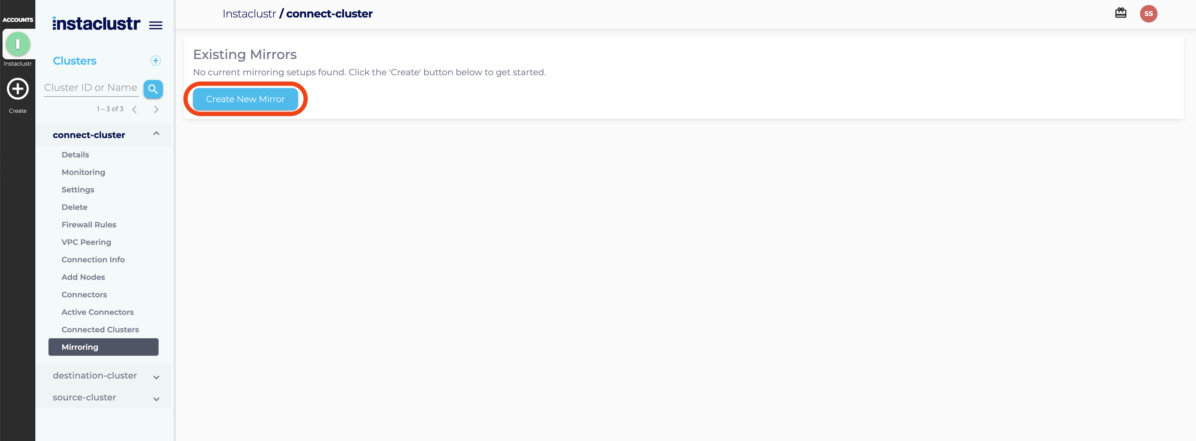 Navigate to the mirroring page for your Kafka Connect cluster on the console and click Create New Mirror.