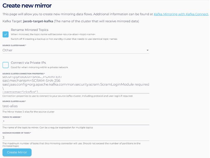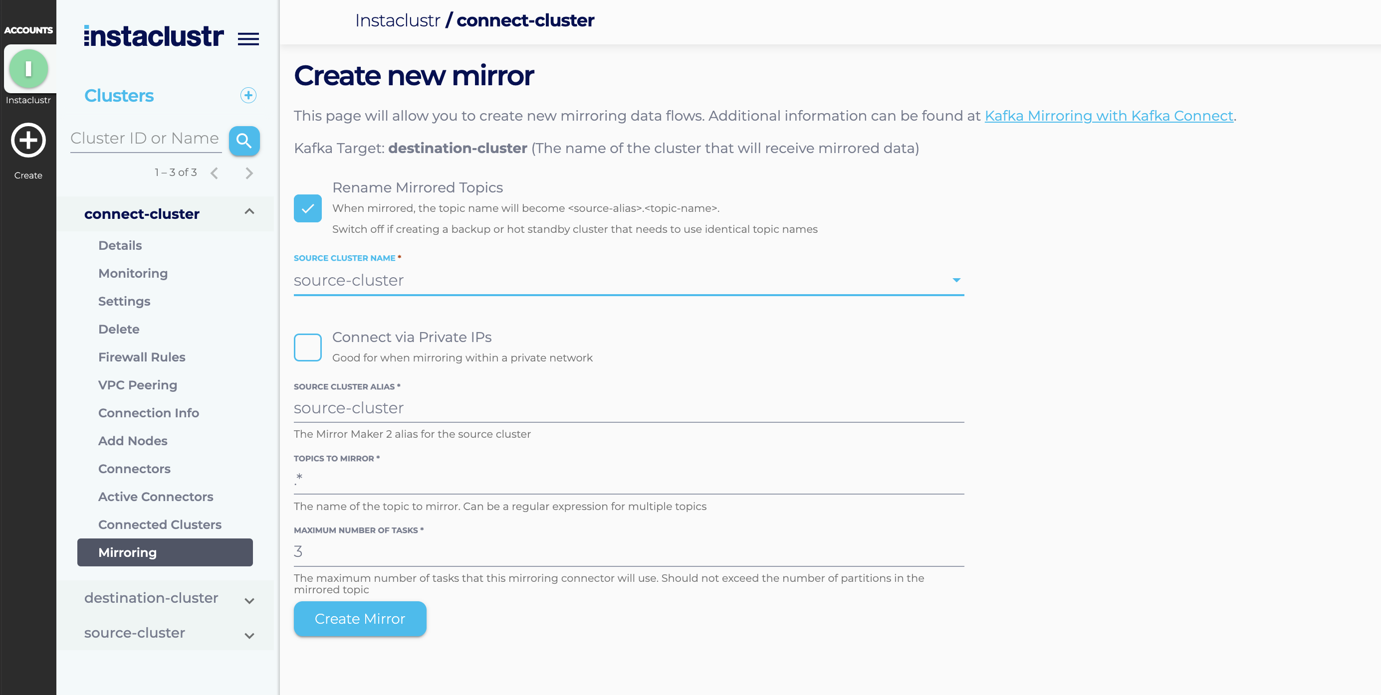 - Go to the “Mirroring” page of the Kafka Connect cluster and select “Create New Mirror”