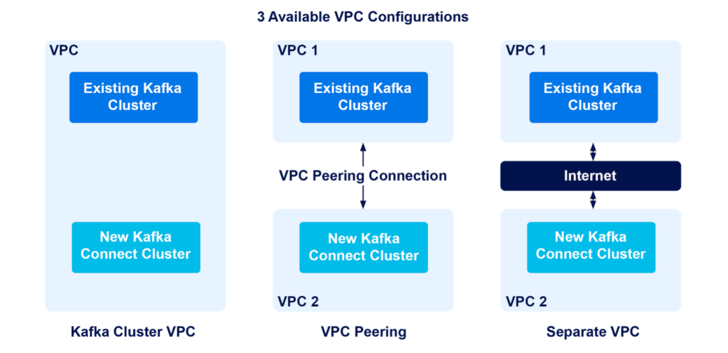 Figure 2: Different VPC configurations for setting up the Kafka Connect and target Kafka cluster