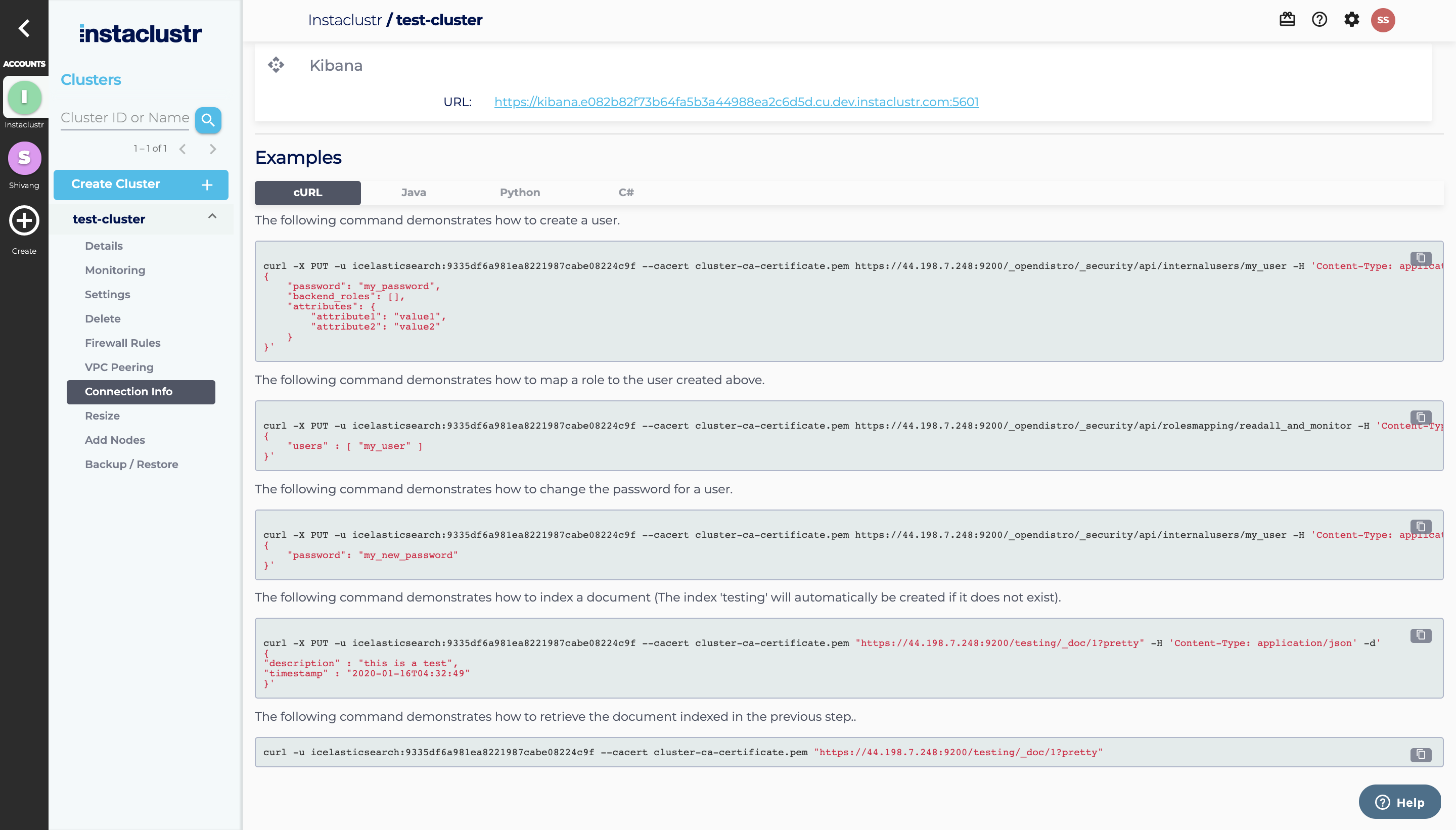 Now that you’ve created a cluster, it’s time to connect your application to your new Elasticsearch cluster. Aside from setting your firewall rules, Instaclustr provides a few examples (customised to your cluster) for the wide selection of client libraries Elasticsearch supports to help you through this process.