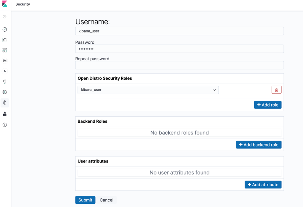 Start kibana e.g. bin/kibana Go to Kibana in your browser e.g. localhost:5601 Then you can then log in with the icelasticsearch user. This user will give you access to the security plugin page. You can add other users and roles there. For example, you can add a Kibana user and stop using the all-access icelasticsearch user with Kibana.