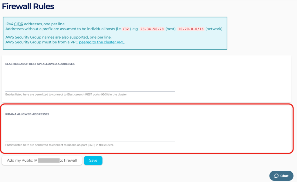 - In the Kibana Allowed Address textbox, enter the IP address you wish to trust to the Kibana Allowed Addresses. Click the Save button when you are finished.