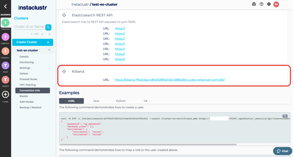 - The Kibana url will take you to the Kibana console. If you’re running both Kibana and a Private Network cluster, additional configuration will be required in your environment to allow a browser to access the specific Kibana URL provided.