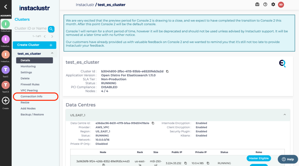 - Select your instance in the Instaclustr Console and then select Connection Info from the navigation menu.