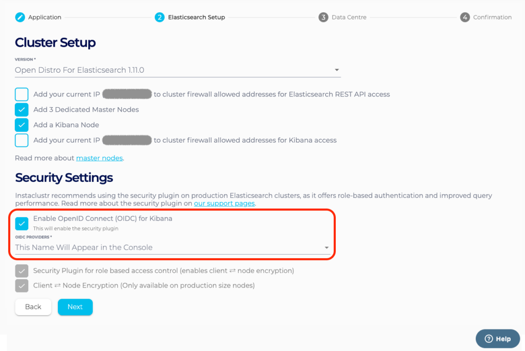 - Select the OpenID Connect (OIDC) for Kibana checkbox on the Elasticsearch Cluster Setup page.