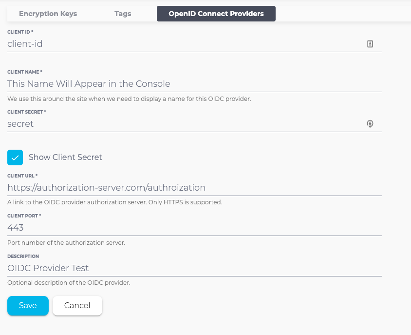 - All fields are required except Description. As you will have a different OIDC Application (or Provider) for each app, Client Name is chosen by you and should be a name that you can use to identify this OIDC provider and application when adding OIDC to your new cluster.