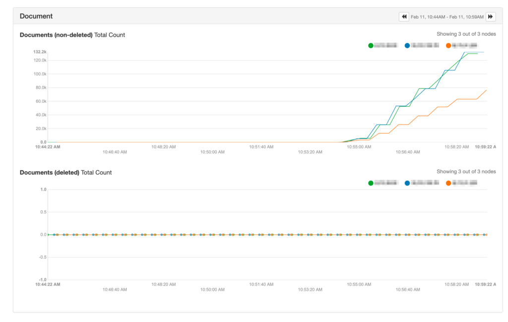Documents are inserted, updated and deleted from a cluster. The metrics below show the total number of documents in a cluster and total count for documents being deleted from a cluster. Please note that the total count reported excludes documents from indices used to calculate SLA metrics.