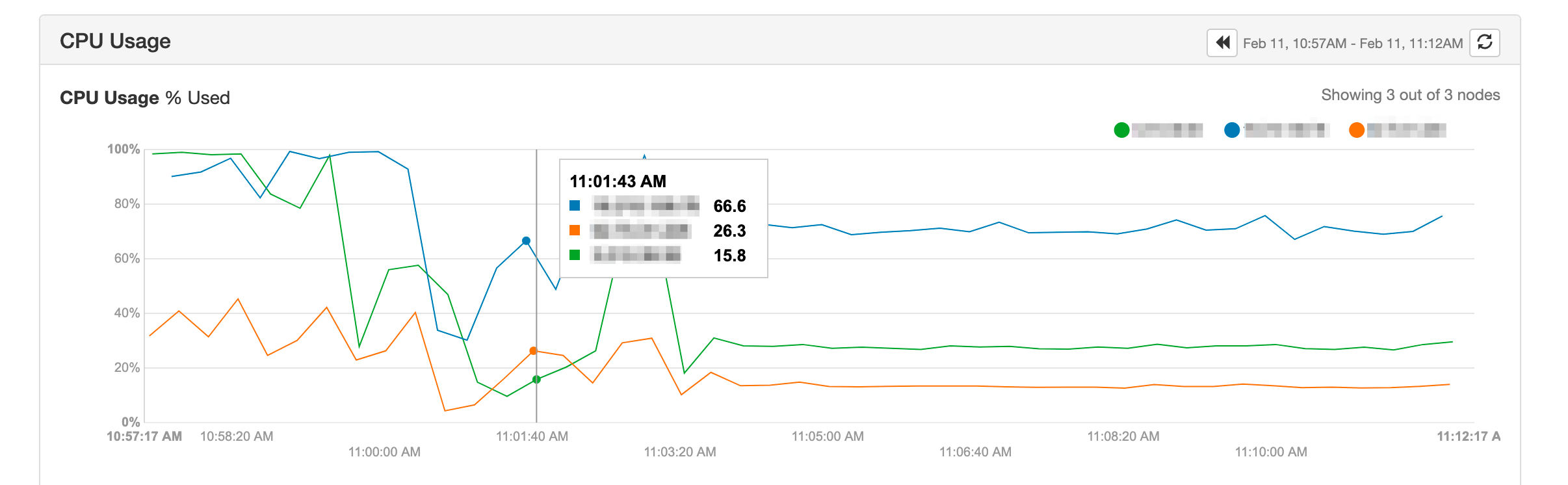 The CPU usage metric shows the percentage of CPU utilised on your node. The percentage shown is the percentage of total CPU available (ie the maximum possible is 100% no matter how many CPU cores in the node). High CPU usage is one indicator of a node reaching the limits of its processing capacity. If you are experiencing consistently high CPU usage and not reaching the desired throughput on your cluster you may need to tune your data model or add nodes to your cluster to increase processing capacity. Please contact Instaclustr Support should you have any questions regarding this metric or the processing capacity of your cluster.