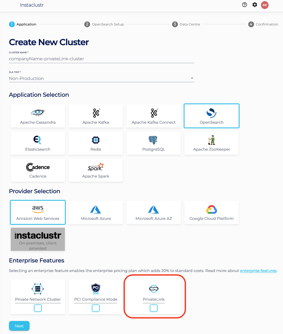 Note: As PrivateLink is currently only supported for AWS, selecting any other provider will cause the PrivateLink option on this page to not be selectable. - Click on the PrivateLink feature and click Next.