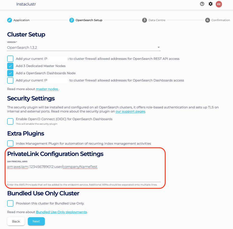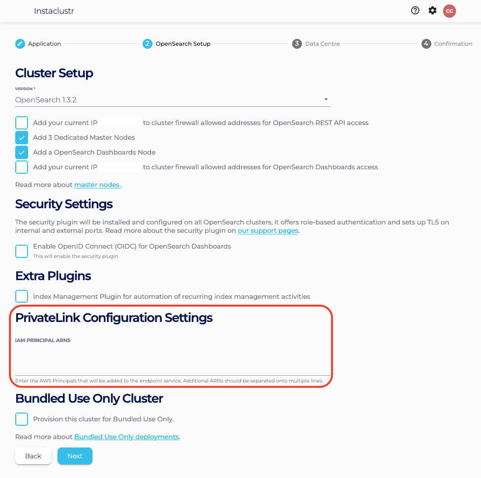 - Under the OpenSearch Setup page, there should be a section called PrivateLink Configuration Settings. In this section, there is one optional field: IAM Principal ARNs