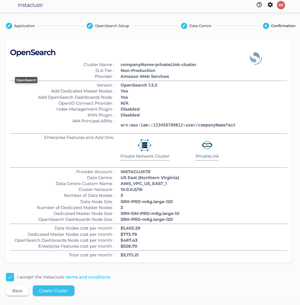 - Under the Confirmation page, check that the configurations such as IAM Principal ARNs is properly configured, accept Instaclustr terms and conditions, and click Create Cluster.