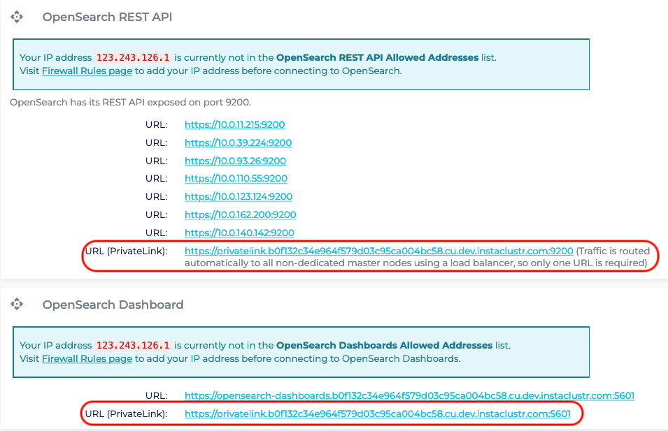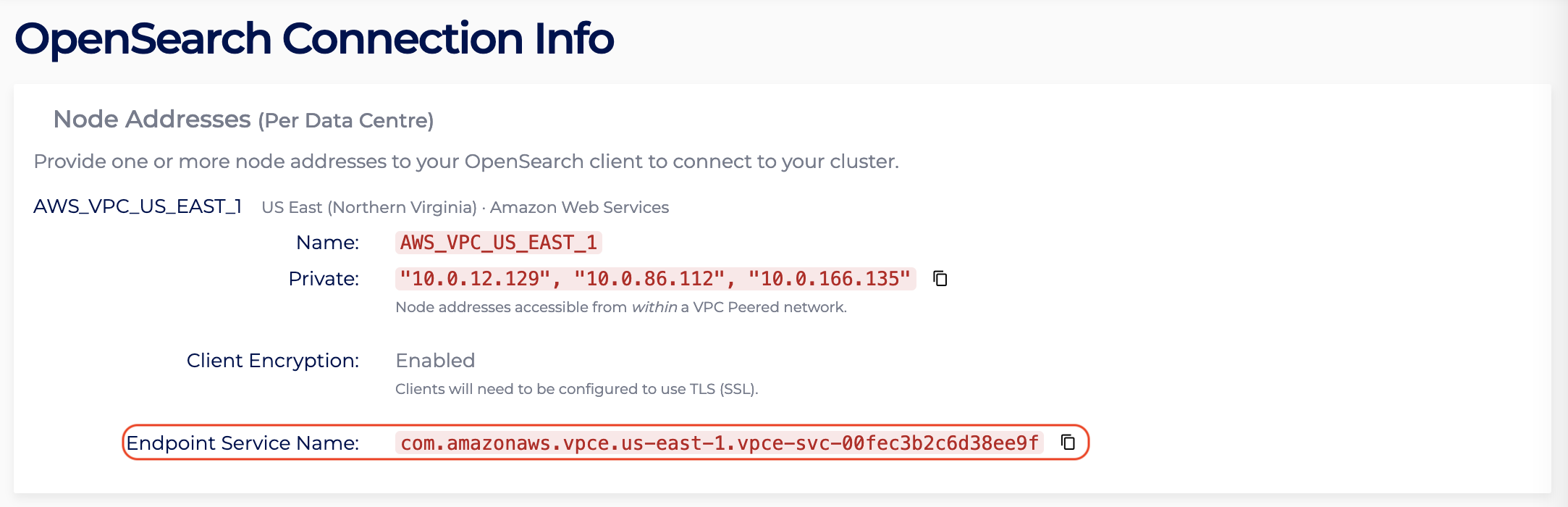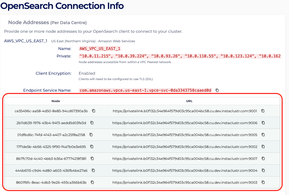 - In the Connection Info page, identify the region of the created OpenSearch PrivateLink cluster. For instance, the page shows the region is US_EAST_1, hence access to the AWS VPC Endpoint console in the US_EAST_1 region: https://us-east-1.console.aws.amazon.com/vpc/home?region=us-east-1#Endpoints: