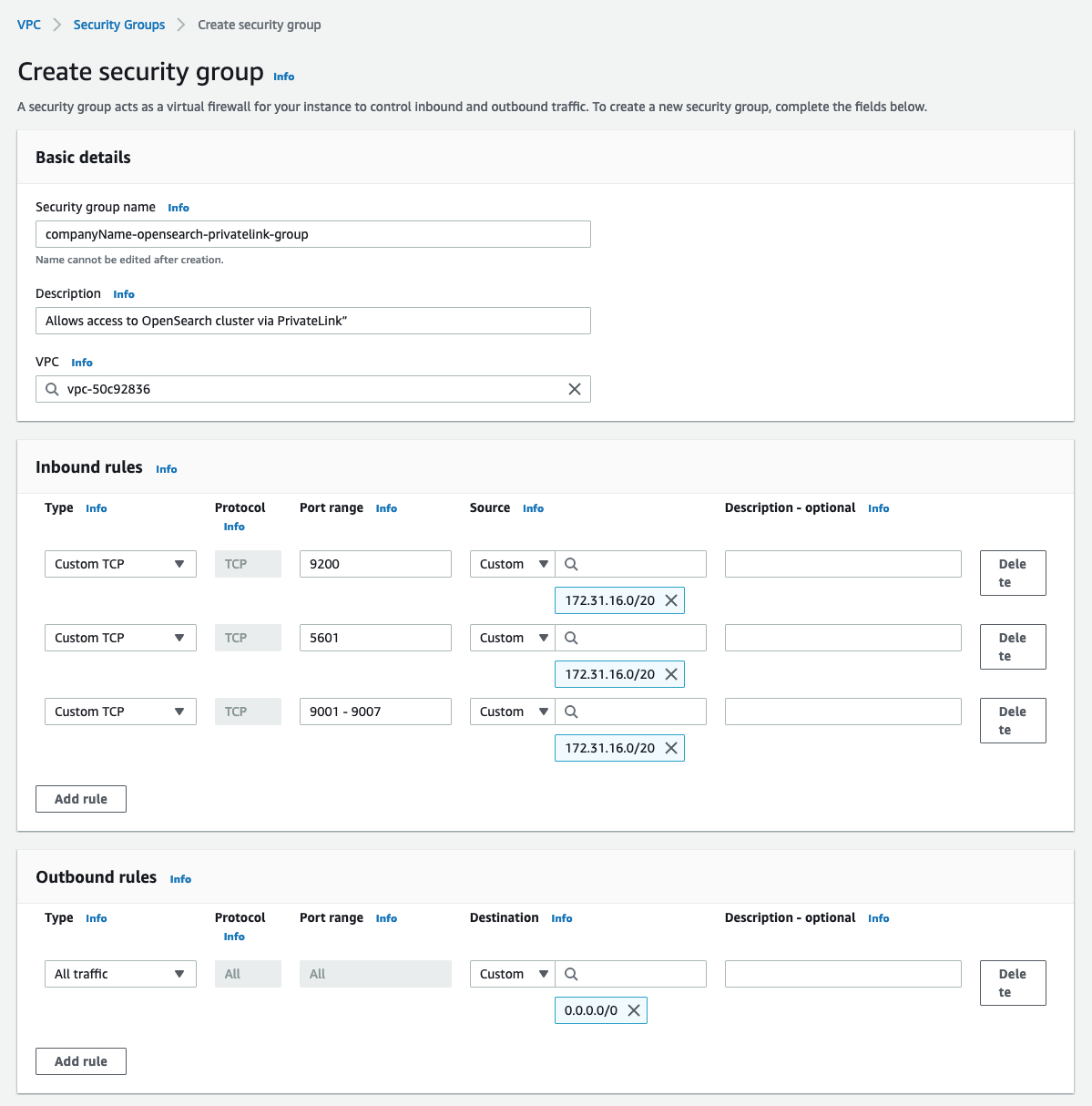 - Under the heading “Security group name”, enter a name for the security group. For example, “companyName-opensearch-privatelink-group”. The name cannot be edited after creation, thus it is recommended to use a naming convention which allows easy identification of the PrivateLink endpoint and destination cluster it will be associated with.