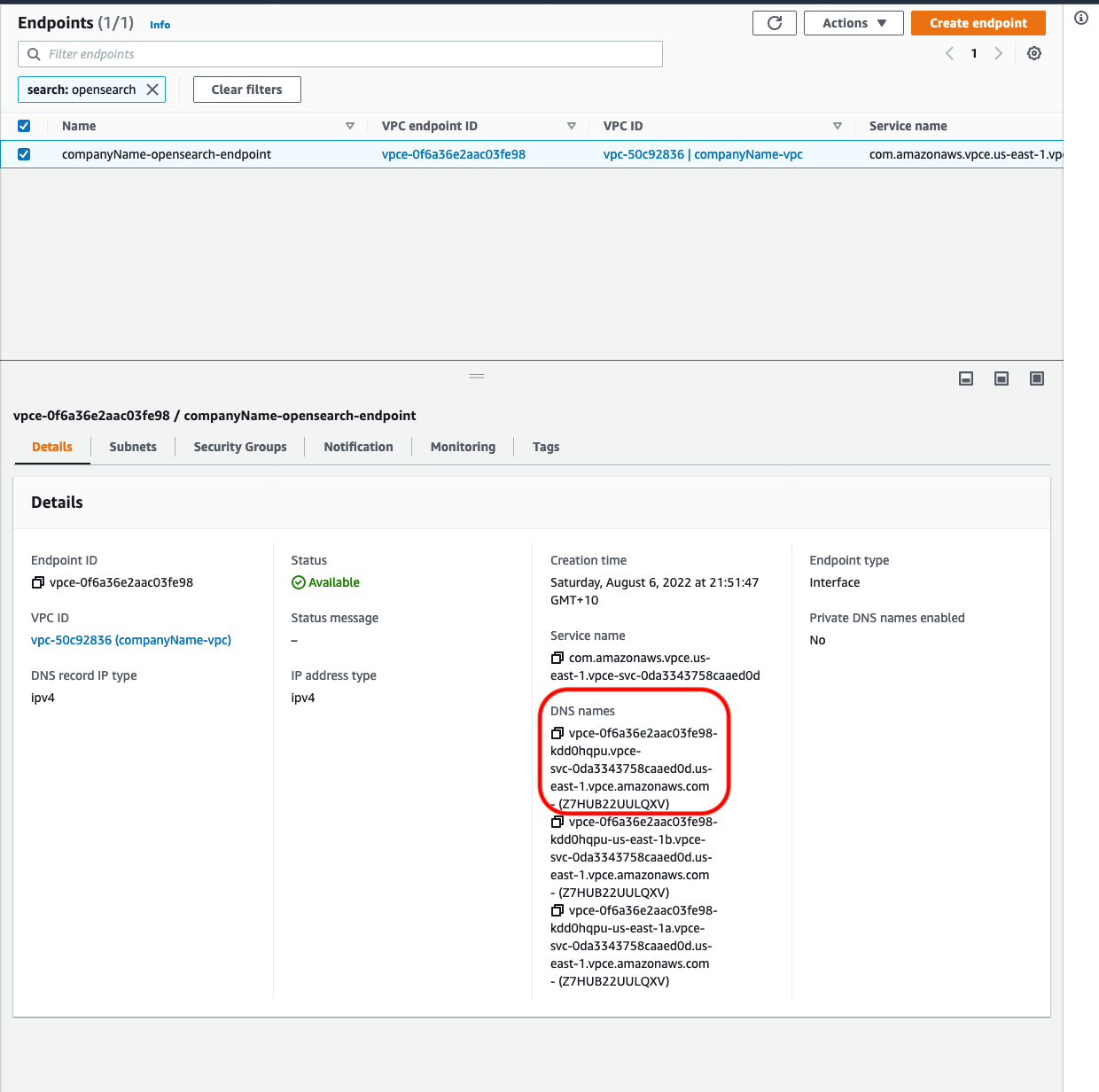 - You will be redirected to the main VPC endpoint page which will specifically show the created endpoint. Once the Status of the endpoint reaches Available, copy the first DNS under the DNS names.