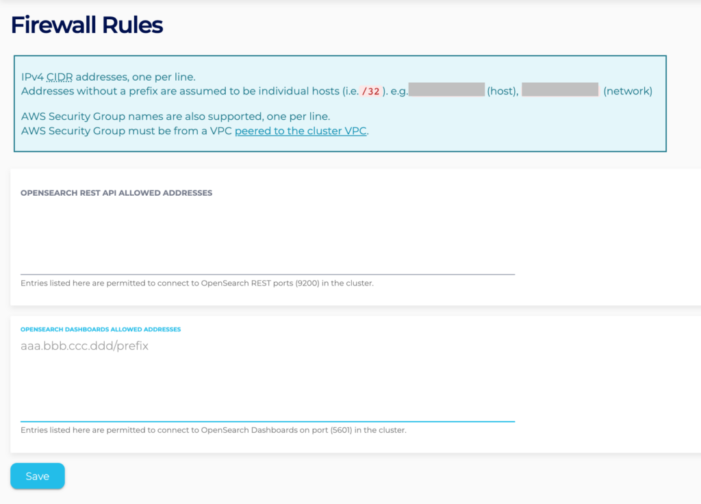 To receive information from a source cluster, firewall rules need to be added to allow the necessary ingress traffic. For example, when the source is another cluster, you can add IPs of that source cluster to the Firewall Rules page.
