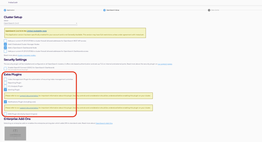 The plugins can also be provisioned from API or Terraform V1. More information about API request can be found: https://instaclustr.redoc.ly/#operation/extendedProvisionRequestHandler