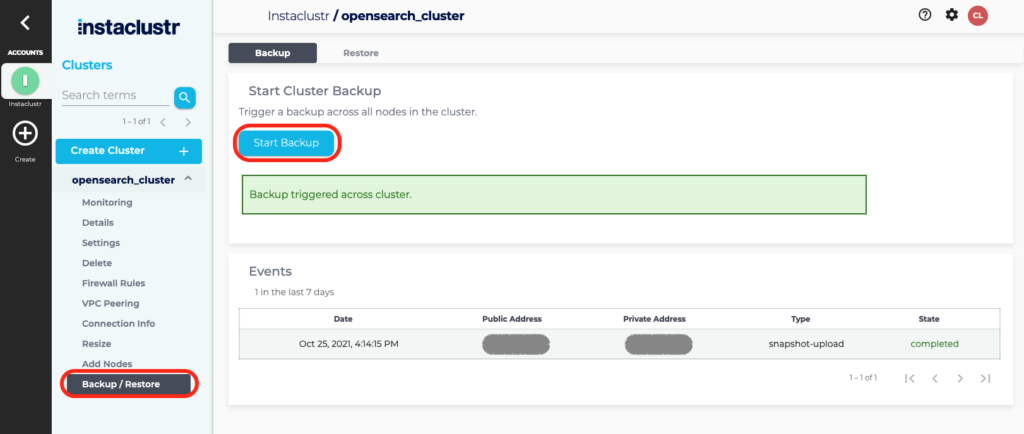 To perform a Manual Backup, navigate to the Backup/Restore page of your cluster and click on Start Backup.