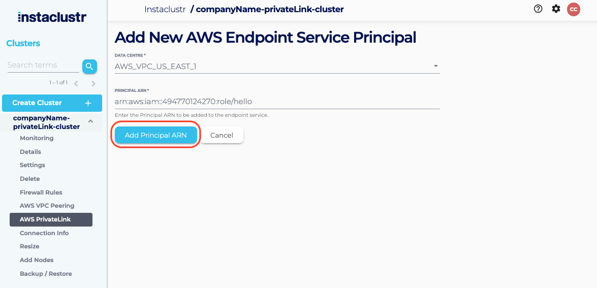 - Once your cluster has been provisioned, you can manage Principal ARNs through the Instaclustr console. Navigate to the AWS PrivateLink tab of your cluster and then click on Add New Principal ARN.