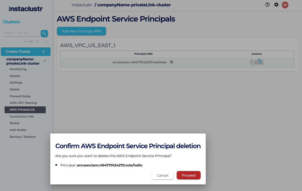 - To remove an existing Principal ARN, locate it in the table and click on the Delete button in the Actions column alongside it. A dialog box will appear where you can confirm your removal of the Principal ARN. Click on Proceed to remove the Principal ARN.
